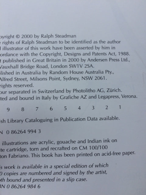 1st edition 1st impression in fine condition. Flat signed by Ralph Steadman to title page. No markings, binding firm, all pages clean. Small nick to bottom of spine. Marks to corners and bottom edge. Please see pics. Paypal accepted, any questions get in touch.