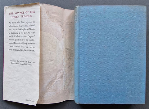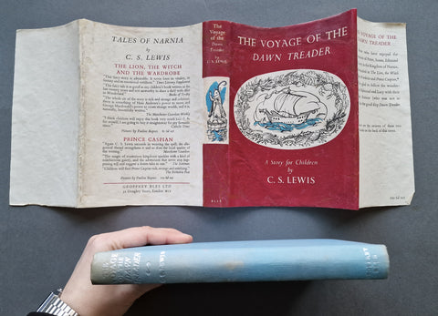 The Voyage of the Dawn Treader by C S Lewis. First UK edition. First impression from 1952 in a 1st dust jacket. There is a small previous owner inscription to the front endpage. There is some foxing to the copyright page. No other internal markings, other pages clean, binding firm. There is some toning to boards and spine. The jacket has been professionally restored.