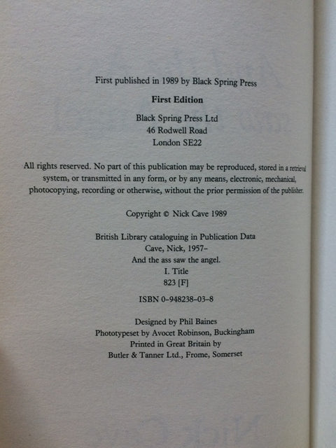 And the Ass Saw the Angel by Nick Cave. First edition (1989). First impression. Medium format hardback in near fine condition. All pages clean. No markings, binding firm. Dust jacket has edge wear. Now in removable protective sleeve.