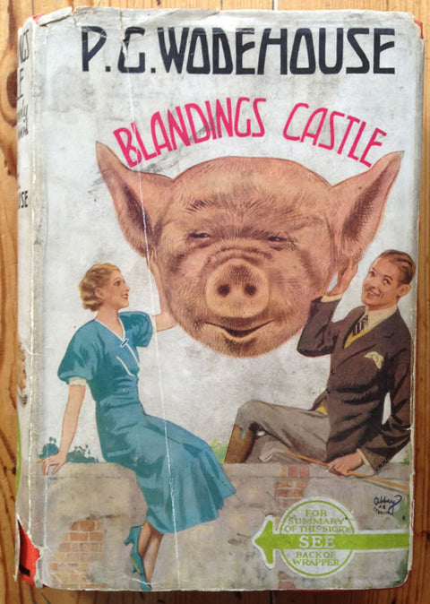 Blandings Castle by P G Wodehouse. First edition, second impression (1936). Undated but published in 1936. The book is near fine. Boards are clean, pages have tanning, no other markings. The jacket is good only front and back are taped together with archival tape, some loss and other tears, cover quite grubby, now in removable protective sleeve.