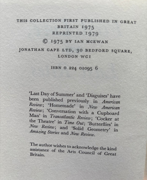 First Love, Last Rites by Ian McEwan. First edition, second impression from 1979 in fine condition. Pages clean spine tight. No markings. The jacket has been price clipped, now in removable protective sleeve.