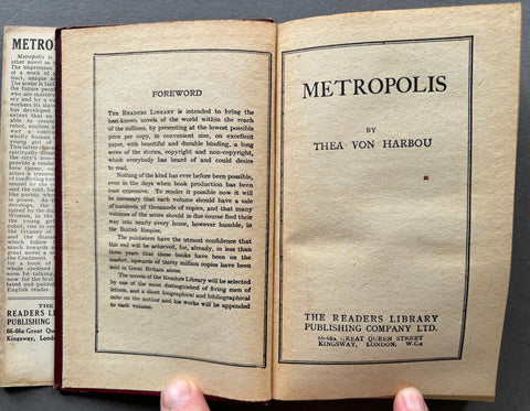 Metropolis is a 1925 science fiction novel by the German writer Thea von Harbou. The novel was a treatment for Fritz Lang's 1927 film Metropolis, on which von Harbou and Lang collaborated in 1924.